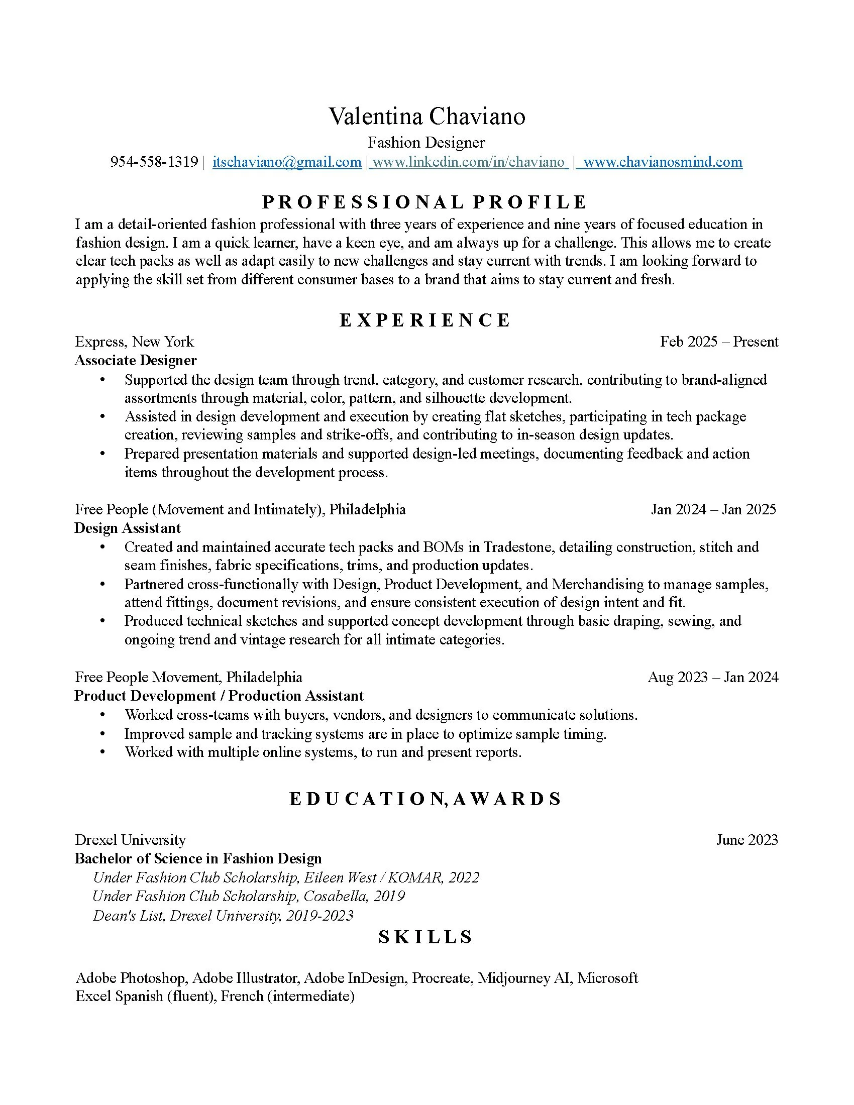 For me, it's not just about aesthetics, it's about how a piece makes someone feel. With a detail-oriented mindset and a strong grasp of both creative and technical design, I excel at developing clear, production-ready tech packs and staying aligned with evolving trends. I believe I adapt quickly, collaborate well with buyers and vendors, and bring a fresh, consumer-focused perspective to every project.
